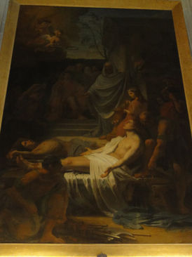 Ce tableau d’Edouard Jolin illustre la scène du martyre de St Gohard.
